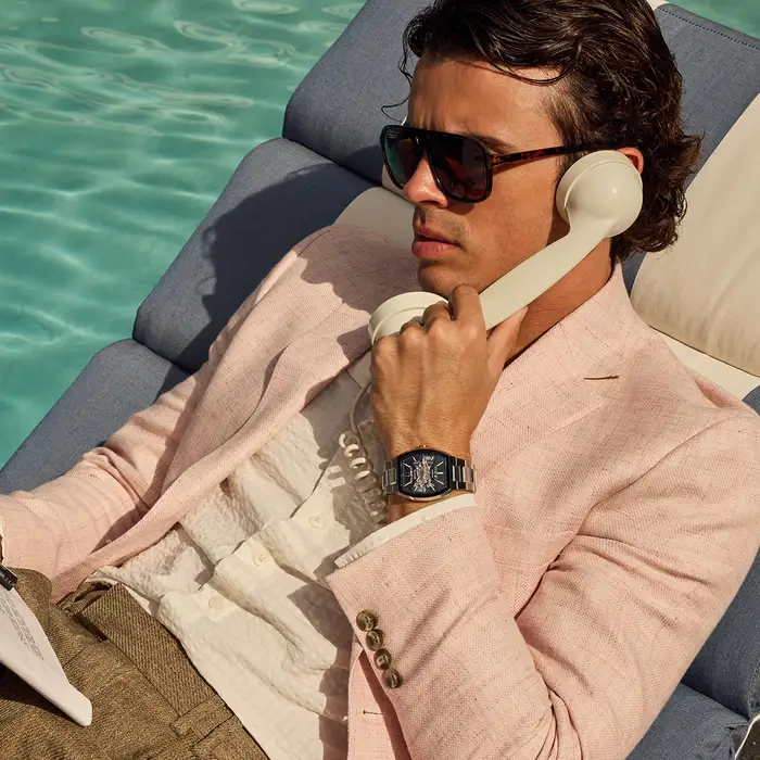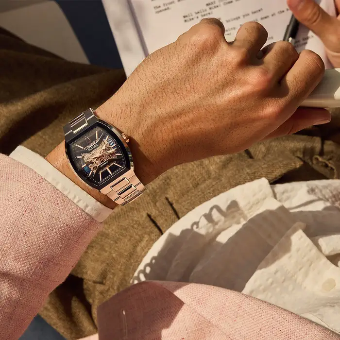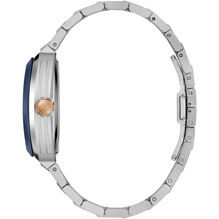 This Bulova men’s watch from the Maquina collection offers daringly avant-garde design. The watch features a 40mm  stainless steel case with a curved sapphire crystal, a blue bezel, a rose gold crown and a silver-tone stainless steel bracelet with a push-button deployment closure. The blue patterned dial with black dial ring and bridges has rose-gold tone hands and markers with luminescent fill and a central aperture revealing the inner workings of the 21-jewel automatic, skeletonised movement which has a 42-hour power reserve and is also visible through the transparent case back. With its mechanical heart and unrivalled modern form, this Bulova men’s timepiece offers a uniquely individual expression of style.