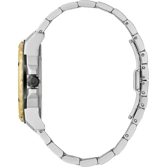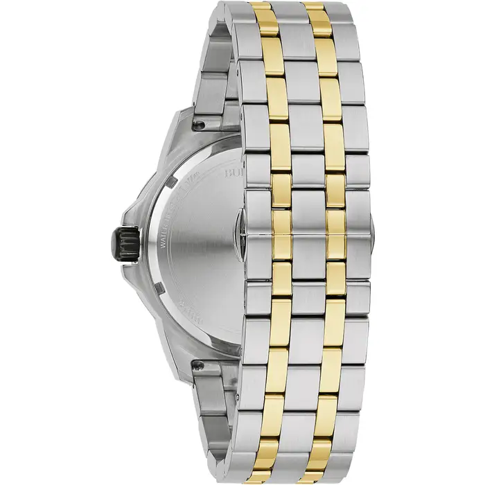 From the Marine Star collection, Bulova introduce’s the newest additions for men. Styled here with a two-tone stainless steel case and bracelet and sleek black dial with gold-tone accents. 8 diamonds adorn for a subtle look of elegance. Additional features include 100 metre water resistance, screw-back case and mineral crystal.