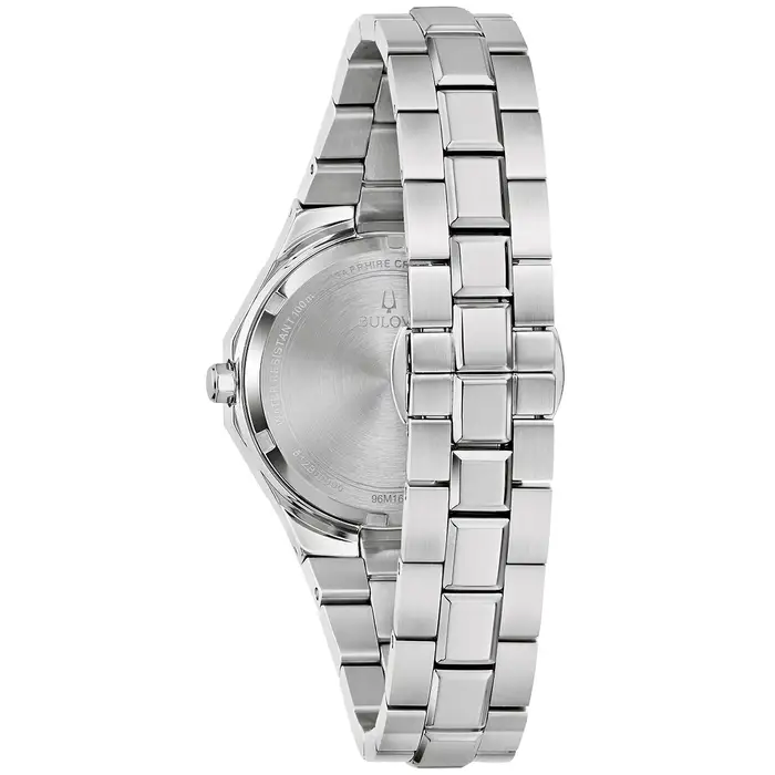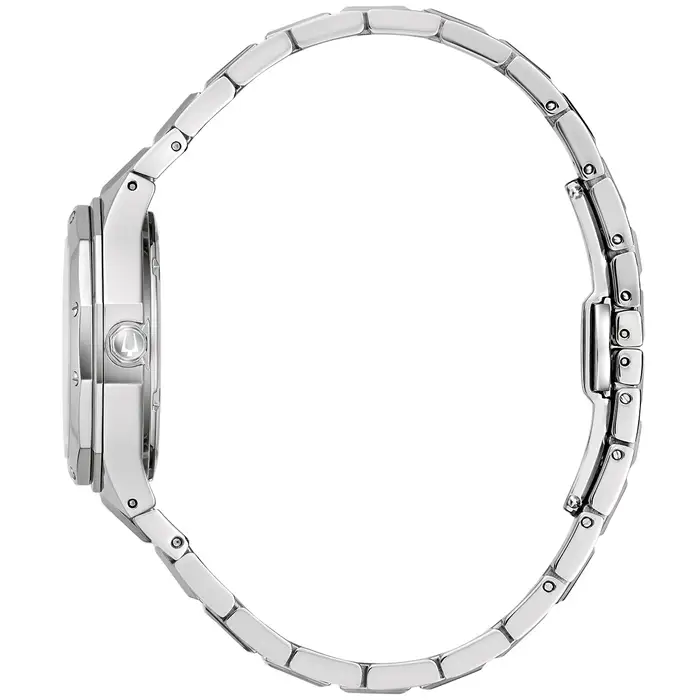 Bold, elevated design characterises this Classic Bulova Prestige women’s timepiece that balances bold design with an elegant presence. The watch features a faceted 32mm silver-tone stainless steel case with a geometric bezel, flat sapphire crystal with anti-reflective coating, 100m of water resistance, and a chamfered 3-link bracelet with brushed and polished finishes and a push-button deployment closure. The rich purple ombre dial has a crosshatch pattern, with silver-tone hands and applied markers with Super-LumiNova luminescent fill and a date display. Striking in both its modernity and its sophistication, this Bulova ladies’ watch is an ideal companion on any wrist.
