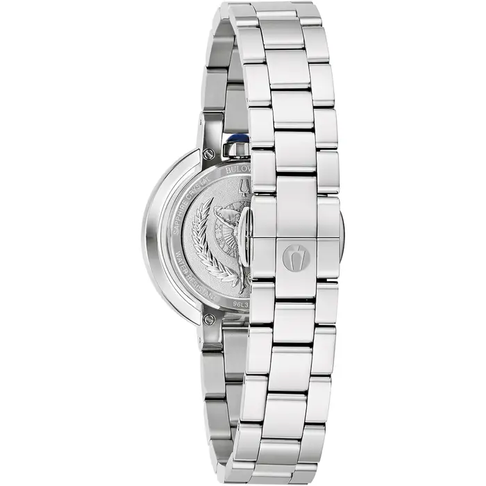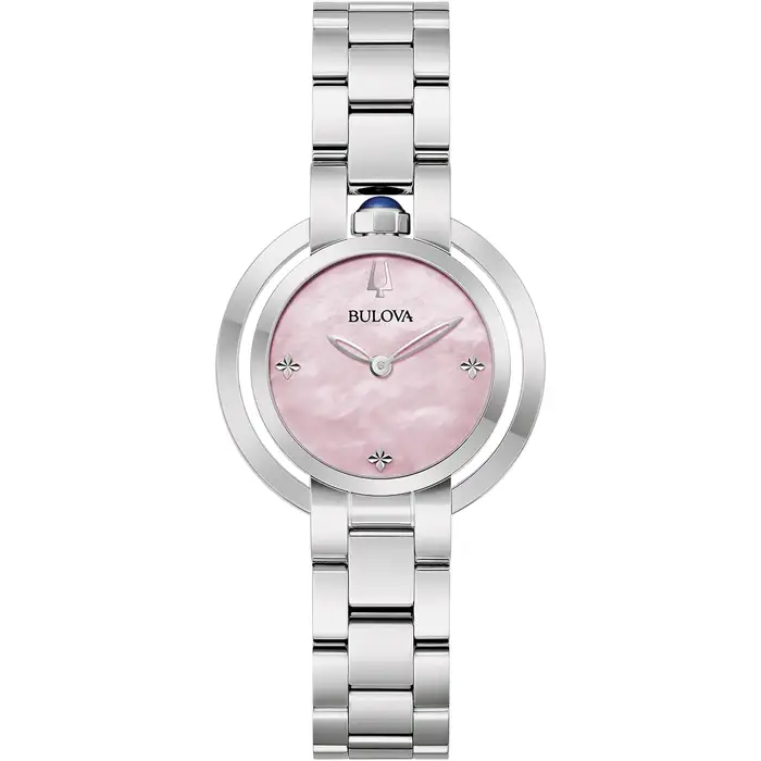 Reinventing legendary style, this Bulova women’s watch introduces a new petite model to the historic Rubaiyat collection. A synthetic blue spinel cabochon crown accents the 30mm silver-tone stainless steel case that features a sapphire crystal and a matching bracelet with a push-button deployment closure. Elegant silver-tone hands and faceted clover-shaped markers appoint the lustrous pink mother-of-pearl dial. Enhance any ensemble, day or night, with this quintessentially feminine Bulova ladies’ timepiece.