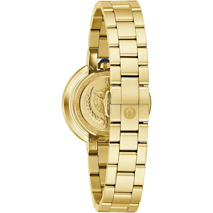 Reinventing legendary style, this Bulova women’s watch introduces a new petite model to the historic Rubaiyat collection. A synthetic blue spinel cabochon crown accents the 30mm gold-tone stainless steel case that features a sapphire crystal and a matching bracelet with a push-button deployment closure. Elegant gold-tone hands and faceted clover-shaped markers appoint the lustrous white mother-of-pearl dial. Enhance any ensemble, day or night, with this quintessentially feminine Bulova ladies’ timepiece.