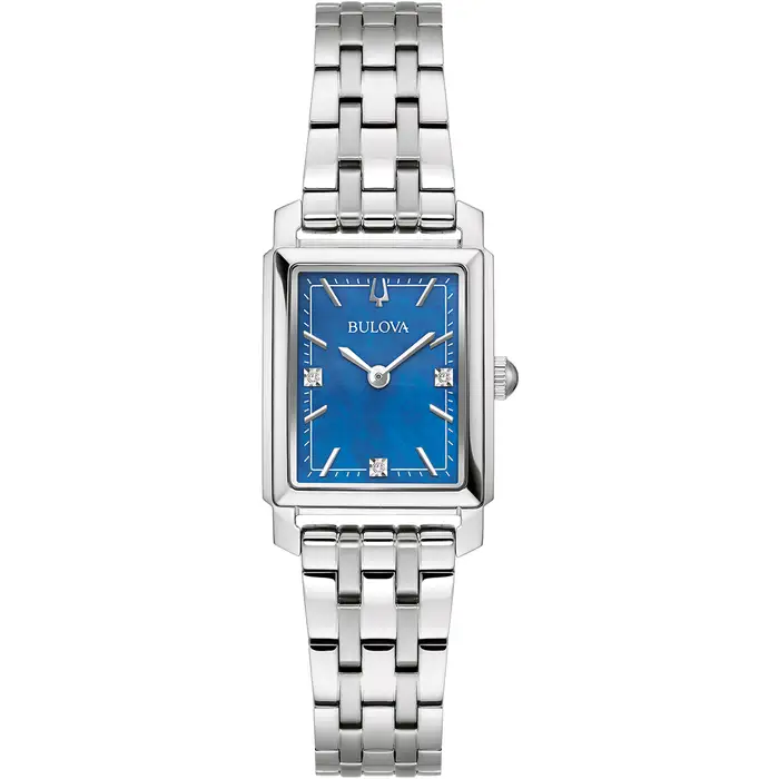This Bulova ladies’ timepiece adds further character to the already impressive Sutton Collection. The refined silver-tone stainless steel case features a finishing that shines brilliantly in the light. The lustrous genuine blue mother-of-pearl dial is accented with 3 diamond hour markers and silver-tone indices and matching hands, for a look of unparalleled beauty. A matching five-link silver-tone stainless steel bracelet completes the look perfectly. A Bulova ladies’ timepiece perfectly styled for a woman ready to make a statement.