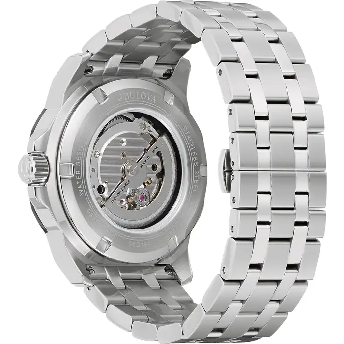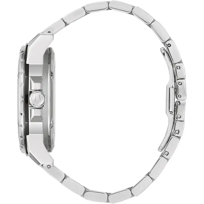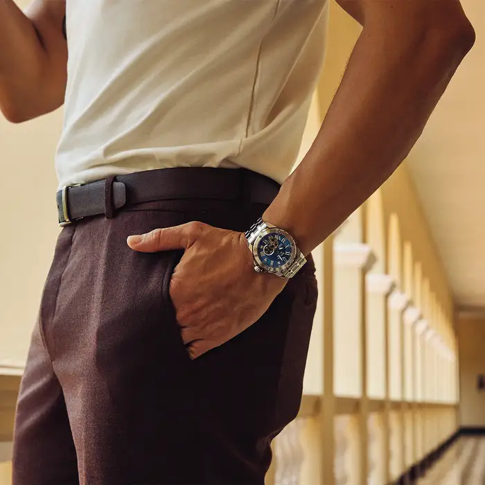 Capturing the daring style of Marc Anthony, one of music’s most influential artists, Bulova presents the all-new Marc Anthony Series A. The bold, angular silver-tone stainless steel case features brushed finishing with polished accents, a silver-tone bezel with grey accents, a flat mineral crystal, and a screw-down crown. The stunningly vibrant blue dial combines sunray texture along the hour track and a central dial with a radiant sunburst finish, complete with hands with luminescent treatment, polished indices, and a grey running seconds sub-dial. The dial is further accented with diamond hour markers at 1, 3, and 5 o’clock, chosen by Marc for personal significance. Visible through both the dial aperture and an exhibition case back, the open heartbeat automatic movement features 21 jewels and a 42-hour power reserve. The 44mm watch has 200m of water resistance and is complemented with a matching silver-tone stainless steel bracelet with a push-button deployment clasp. Uniting Marc Anthony’s iconic music with Bulova’s proprietary technology and Bold at Heart spirit, this new men’s timepiece will keep you always within style’s rhythm.