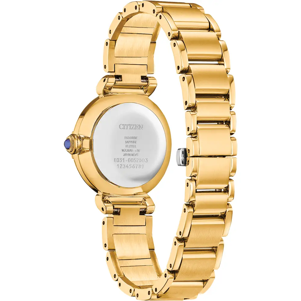 Classic lines and hints of romance make this newest piece to our ladies’ collection, the Citizen L Mae, a glamorous addition of sustainable luxury. With a case design inspired by a vintage perfume bottle and featuring the curved, sleek lines of May bells, the bezel shape has a distinct feature at the 3 o’clock position, where the crown resembles an elegant perfume stopper. Featuring a white, mother-of-pearl dial made of recycled materials from the shell of pearl oysters that are discarded after harvest, and showcased on a sleek, gold-tone stainless steel case and bracelet. The dial also has a diamond that gives focus to the 8 o’clock position and is finished with a sapphire crystal. Sustainably powered by any light with our proprietary Eco-Drive technology that never needs a battery, this elegant women’s watch is the perfect dressed up look with high-powered performance. 5 year guarantee.