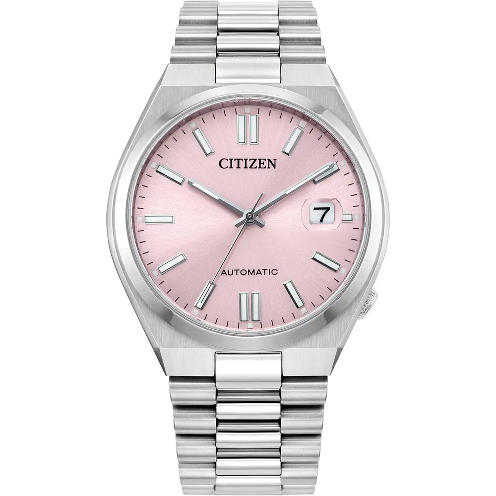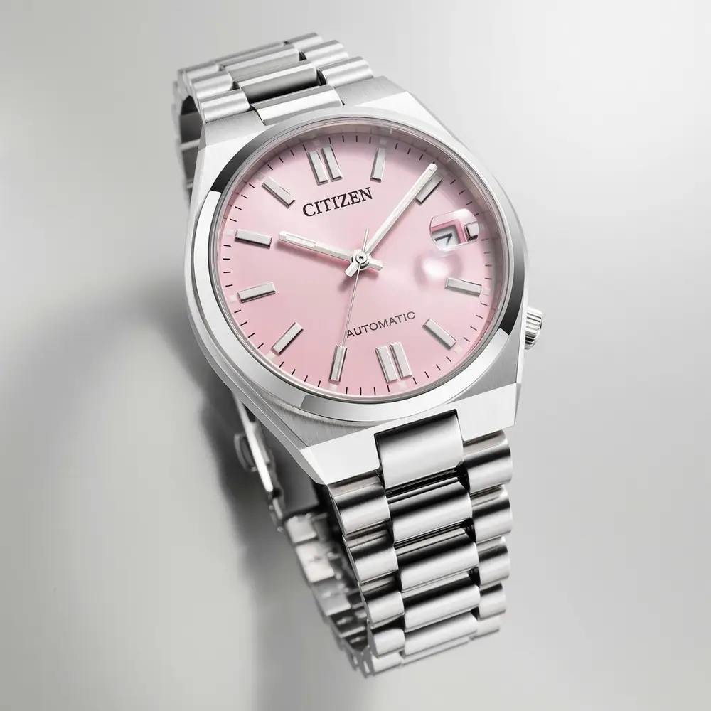 The Tsuyosa Automatic, from the NJ020 series, brings ultramodern sports styling right to your wrist. The sophisticated design of the watch delivers a strong impression via a silver-tone stainless steel 37mm case and a seamlessly integrated matching bracelet. Underneath an anti-reflective sapphire crystal, the sporty timepiece makes use of a sunray pastel pink dial, with a 3 o’clock date window and contrasting silver-tone details adding to its classic configuration. Powered by an automatic movement with a 40-hour power reserve and offering up to 50 metres of water resistance, this refined timepiece is a great daily choice for work, play, and everything in between. 5 year guarantee.