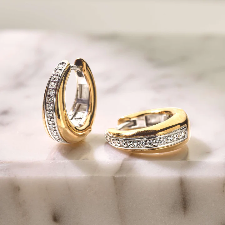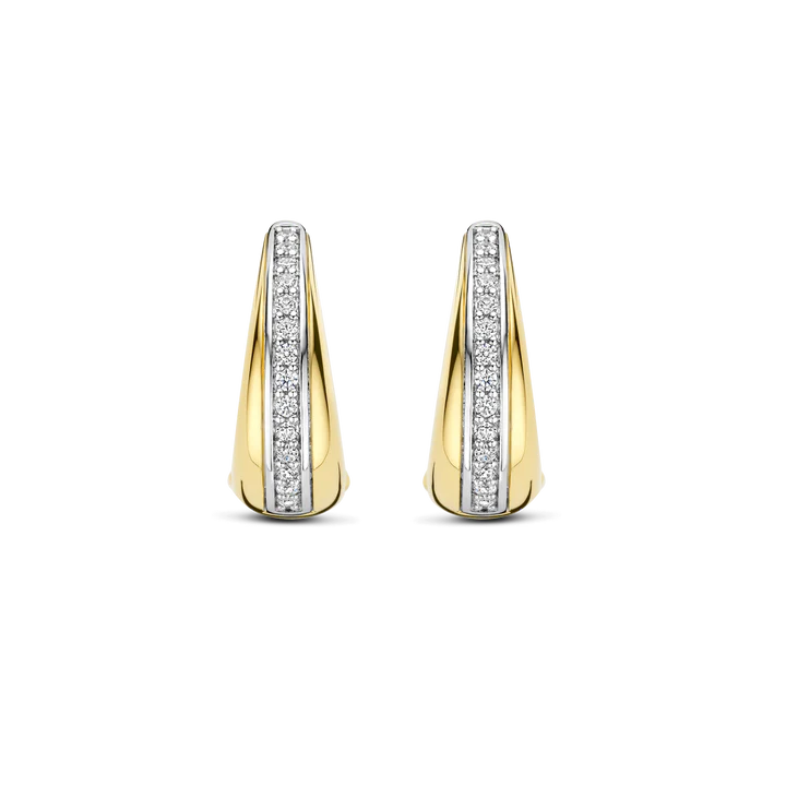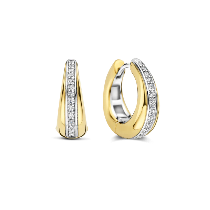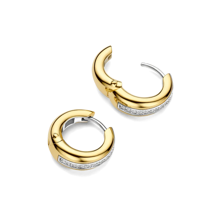 The layered design gives these 18k gold-plated zirconia earrings a modern and luxurious feel with added depth. The combination of the sleek gold-tone surface and the sparkling zirconia makes these hoops true statement earrings, while their size keeps them ideal for everyday wear. Perfect to wear solo or styled with other gold-plated or zirconia jewellery.