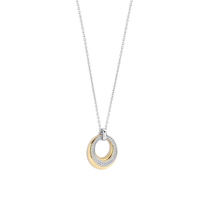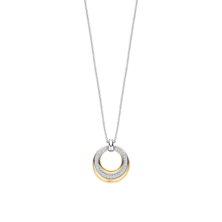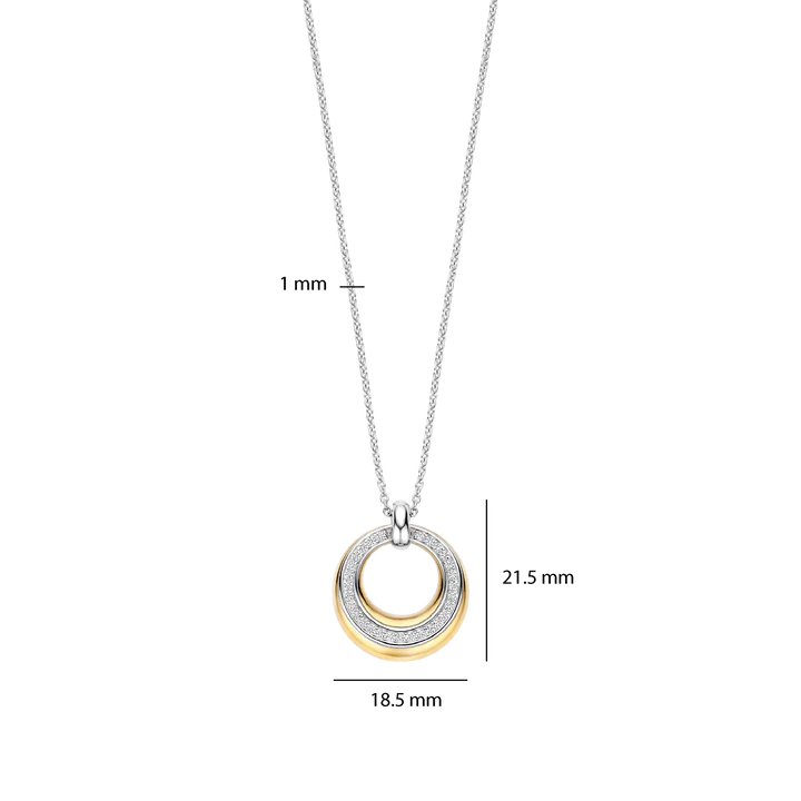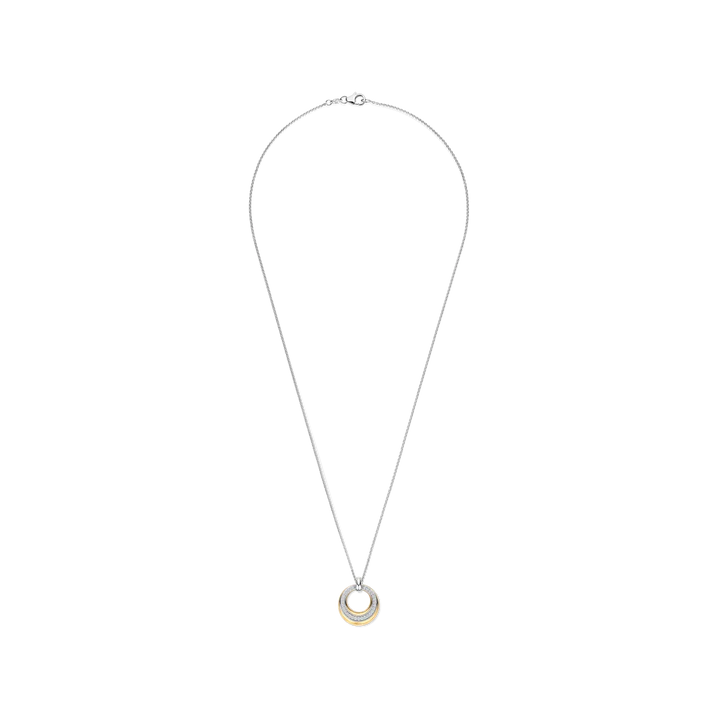 This silver necklace with an 18ct gold vermeil circular pendant is crafted from high-quality 925 sterling silver and features a refined, timeless design. The circular pendant is finished in a warm gold tone and set with a row of zirconia stones that provide subtle sparkle. The open centre adds depth and enhances the light, elegant character of the piece.