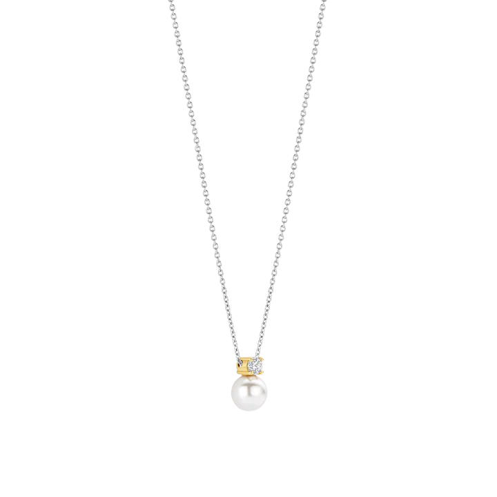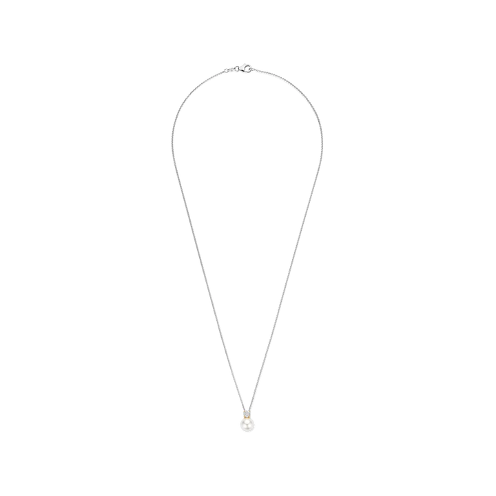 This silver pearl necklace is crafted from high-quality 925 sterling silver and combines a brilliant zirconia stone set in an 18k gold-plated setting with a pearl featuring a crystal core. The warm gold-plated setting creates a refined contrast with the silver chain and enhances the sparkle of the zirconia. Together with the soft glow of the pearl, this design achieves a sophisticated and luxurious look.
