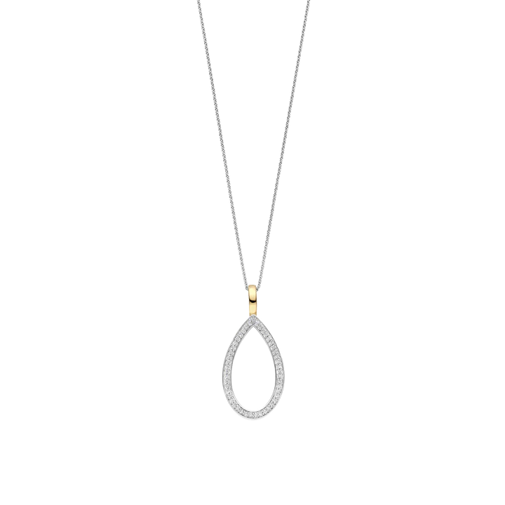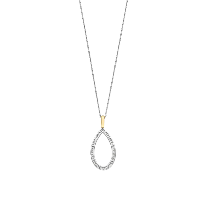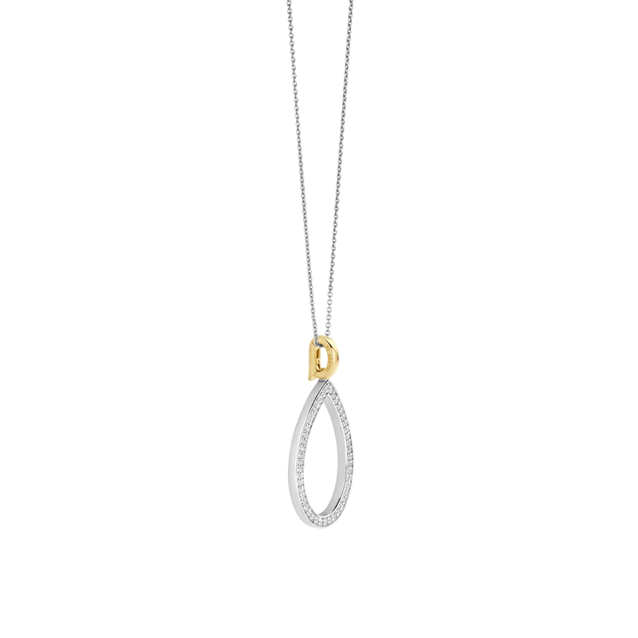 Add a refined statement with this TI SENTO gold-plated silver Pendant 6850ZY. Crafted from 925 sterling silver, the elongated open teardrop shape is pavé-set with brilliant-cut white cubic zirconia and framed by a sleek yellow-gold plated bail. The interplay of gold, sparkle and sculptural form gives this piece an effortless elegance that complements both casual and elevated looks. Suspended from a fine chain, it rests beautifully along the neckline—perfect worn solo or layered with shorter pendants for a personal touch. Nickel-free and hypoallergenic, it combines timeless polish with lasting comfort. The pendant comes with a dainty silver chain necklace.