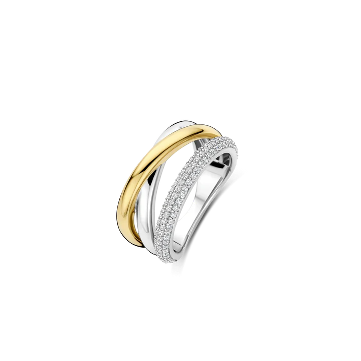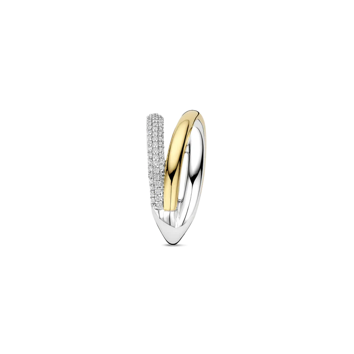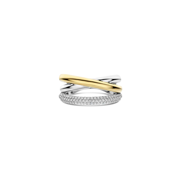 This statement ring instantly brings character to any jewellery combination. Wear it alone for a bold accent or combine it with other rings for a layered look. The contrast between gold tone, silver tone and shimmering zirconia creates a clean, graphic effect that is easy to style.  Size 58 in stock.